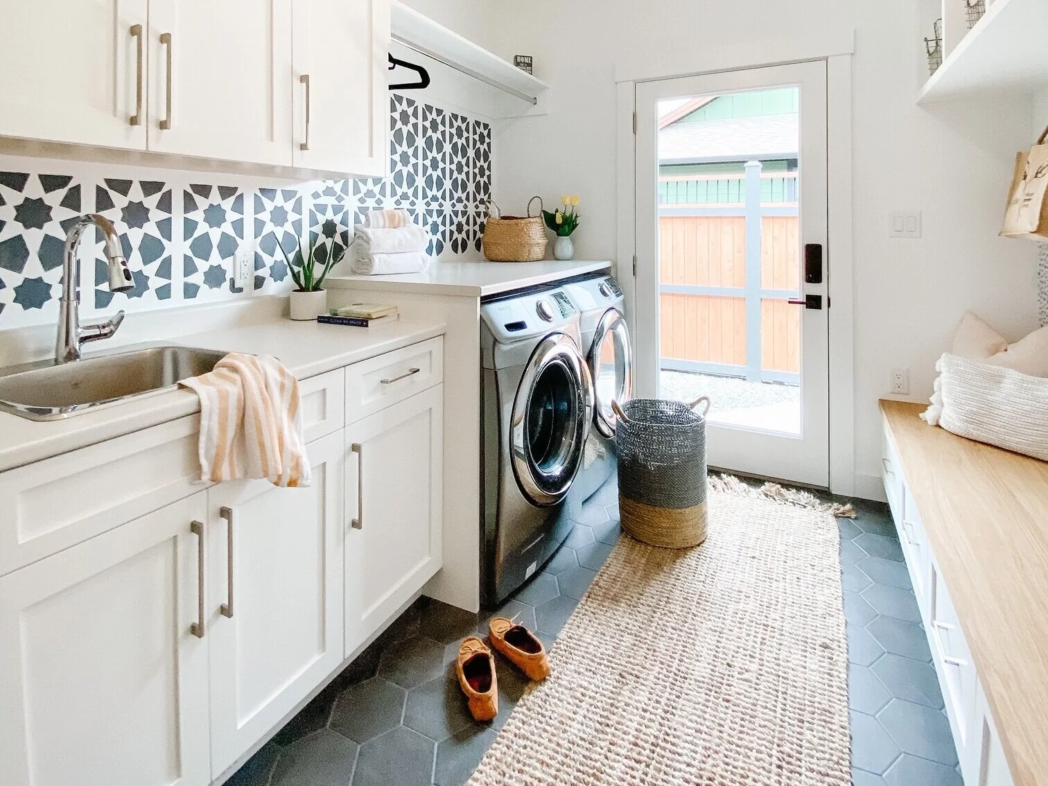 I wanted to transform the mudroom into a more eclectic, fun spot. I went with more risky design choices in the mudroom décor and picked a Moroccan inspired stencil instead of permanent tile backsplash above the laundry area. I then chose a patterned wallpaper in a similar colour but different pattern to the backsplash for the wall above the bench. The speckled wallpaper pattern is playful and something that can be swapped out easily if I want to try something new. The same goes for the stencil as it can easily be painted over and permanent tile installed at a later date.
