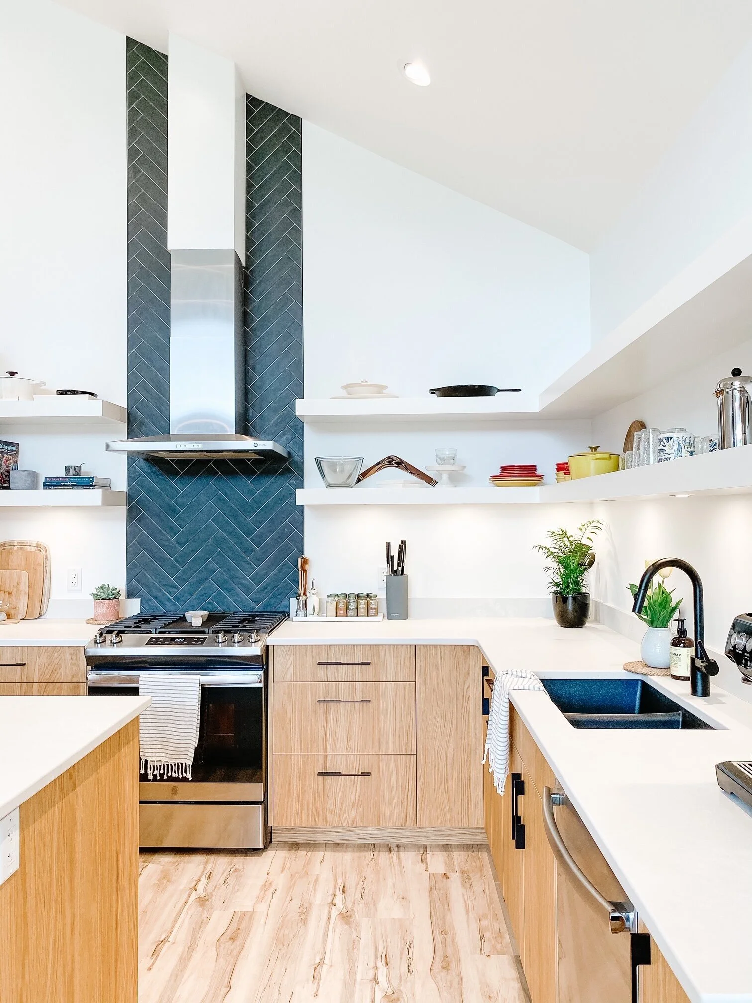 I picked out all of the design elements in our home (with some input from my husband!) from the cabinetry to the wall colour and lighting. I wanted to keep the finishing of the house modern and timeless. I did not want something that would be dated in a few years time that I would want to change. I chose to go with quality products that Heronwood had to offer that will last for many years of wear and tear. The house is a mix of modern Scandinavian and traditional West Coast. I took a bit of a risk with the natural oak cabinetry in the kitchen as it can look dated (think 90’s oak cabinetry). In this case I chose for a modern texture in a warm tone that is comforting in the kitchen and gathering area. I spend a lot of time in the kitchen and wanted a place that I feel comfort in. The oak lower cabinets are offset by more modern open shelving that can be styled differently to change the feel of the room anytime.