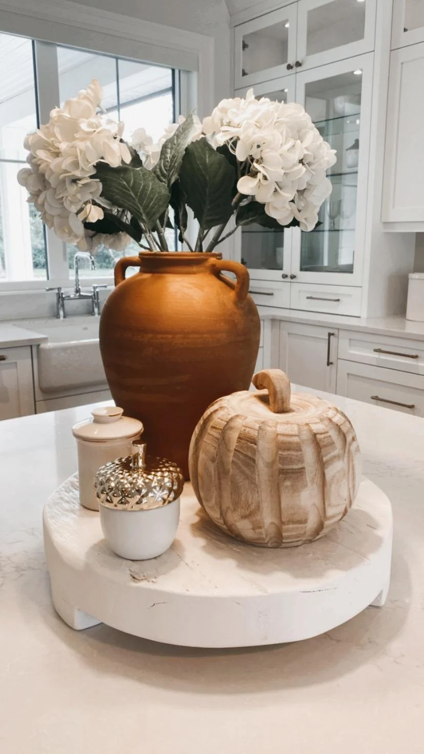 Balance fall tones by incorporating festive decor in neutral colours. Think of adding pinecones, leaves, branches, acorns, and white pumpkins. Natural elements bring in the right amount of fall while remaining easy on the wallet and not overwhelming your space with oranges, reds, and yellows. White and tan are fantastic colour choices.