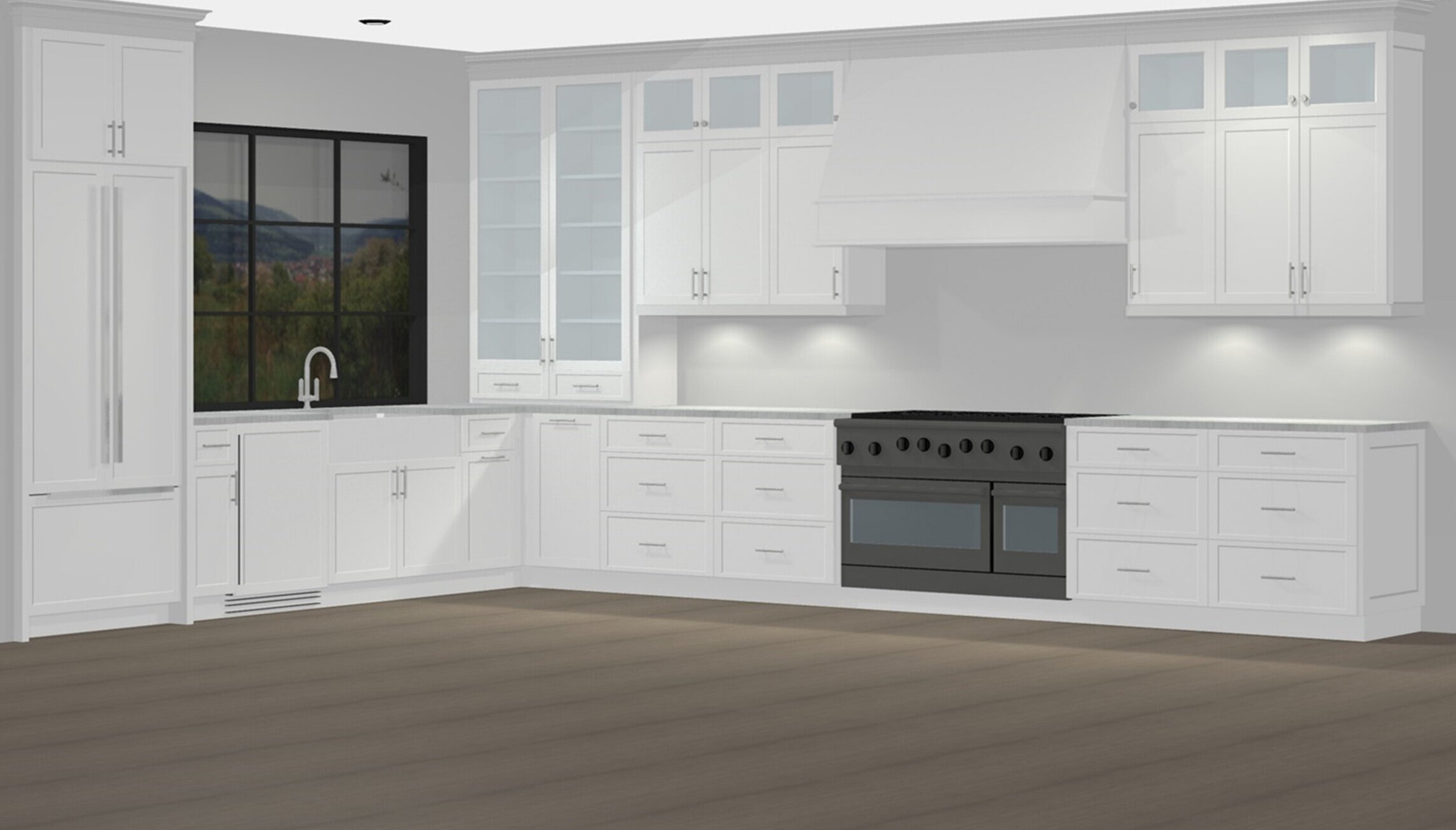 Jason loves incorporating glass as a surprising element in kitchens, so on the range wall, they’ll have a large ceiling-to-counter glass cabinet, as well as glass-stacked upper cabinets with lighting.